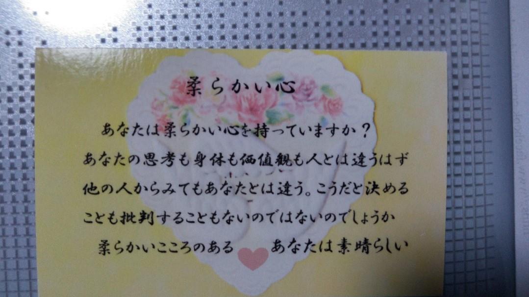 引いたカードの言葉は、柔らかい心でした。その内容は、あなたの思考も価値観も人とは違う。こうだと決める事も批判する事もないんだと書いてありました。自分と相手とは違うんだーもう悩まなくていいんだと分かって思い方を変えたら一瞬で心が楽になり気づかせてもらいました。
