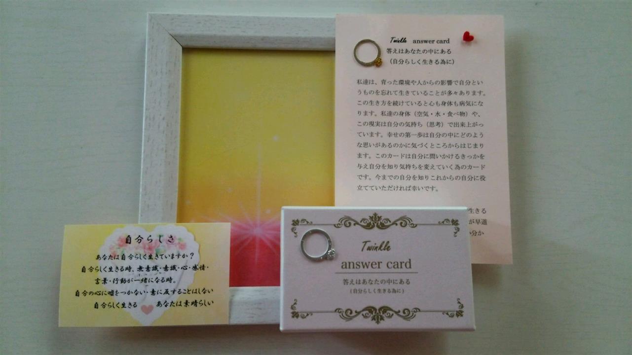 このカードが生まれた訳は、自分らしく生きる為には自問自答をして心の声を聞くことが早道ですが、「自分に何を問いかけてよいのか分からない」そのような声から生まれたカードです。自分を知っている自分は意識の奥にあります。私達は、育った環境や人からの影響で自分というものを忘れて生きていることが多々あります。この生き方を続けていると心も身体も病気になります。私達の身体(空気・水・食べ物)や、この現実は自分の気持ち(思考)で出来上がっています。幸せの第一歩は自分の中にどのような思いがあるのかに気づくところからはじまります。このカードは自分に問いかけるきっかを与え自分を知り気持ちを変えていく為のカードです。あなたが絶妙なタミングで引いたカードが今のあなたに必要な問いかけです。