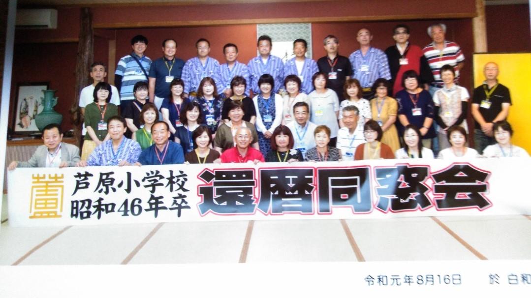 お盆によく開催される同窓会。48年ぶりの小学校の同窓会が開催されました。はがきをいただいた時は少し迷いましたが、「明日がないかもしれない」という勢いで生きている私なのでやはり参加することに決めました。48年ぶりなので皆姿かたちがずいぶん変わっていて誰が誰なのか分からないのではとどきどきしていました。受付では「次は誰かな?」次の人が来ると「早く名札付けて」「あ~○○君だ」と大盛り上がりでした。男性の方はなかなか分からないのですが、女性の方は面影もあり分かりやすかったのですが「え~とお名前は?」「あ~○○さんだ」と分かり当時の呼び方に戻りました。宴会の前に集合写真を撮りました。その時にあわら市の方が取材にいらっしゃっていました。「後ほどインタビューにまわらせていただきます」とのことでした。宴会が始まる時に今までにすてに亡くなられている方達が数名いらっしゃるということで黙祷をいたしました。宴会が始まると、当時男の子も女の子も関係なしに遊んでいたことを思い出し大盛り上がりでした。外で遊ぶことがほとんどで、川に落ちた話しとか、お宮さんで缶けりしたこと、学校内を探検して「きゃ~きゃ~」恐がっていたこと、「誰と誰がマドンナだったんだよ」とか「あの当時あなたのことが好きだった」とかの告白があったり、いろいろな話しに花がいくつも咲き皆が童心に戻り大笑いでした。とても幸せな気分になり楽しい時間を過ごさせていただきました。幹事さん名簿を作るとかご苦労があったと思いますほんとうにありがとうございました。この一瞬の中に現在過去未来がありどのチャンネルにあわせて幸せな気分で生きるかだと思います。同窓会のもようはあわら市HPと福井新聞に記載されるようです。私はHPにはあまり顔出さないのですがこの写真でおしえます。私は前列向かって右から二番目です。