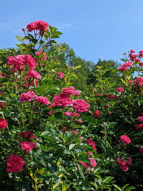 薔薇の赤と新緑と青空のコントラストがとても綺麗。薔薇のほのかな香りで心が癒されます。