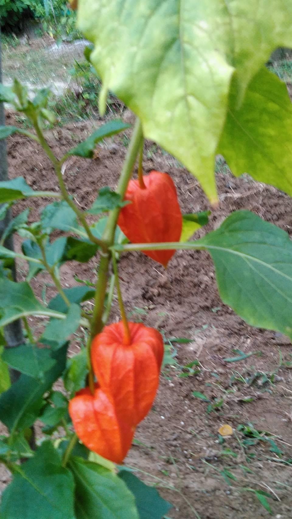 畑にはオレンジ色のほうずき達が実を連ねています。何か話でもしているかのようです。それを見ているととても可愛く思い元気がでます。