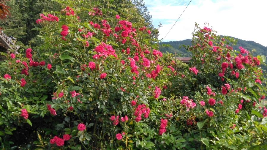 小さい鉢の薔薇を地下植えにしたところ、こんなにも大きくたくさんの薔薇が咲くようにになったのです。グリーンの葉っぱと真っ赤な薔薇とてもよいコントラストでとても綺麗です。心が癒されます。ほんとうに自然の豊かさに感謝です。